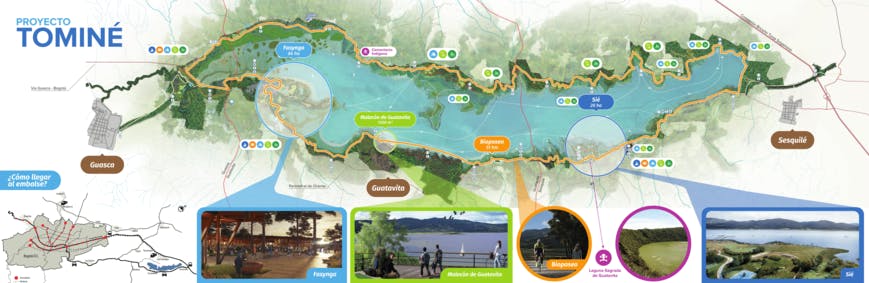 - Ecoparque turístico Guatavita: El Malecón de Guatavita se encuentra ubicado en el municipio de Guatavita, como elemento que busca conectar el casco urbano del municipio y el espejo de agua del embalse Tominé. Su punto central está localizado en las coordenadas 1037700 N, 1025600 E, la unidad de actuación paisajística de Guatavita tiene un área de 181 hectáreas, y el área de intervención en el malecón es de 1.96 hectáreas. Las áreas de intervención proyectadas buscan la rehabilitación de la zona del embarcadero existente en el municipio que tiene un alto potencial turístico.